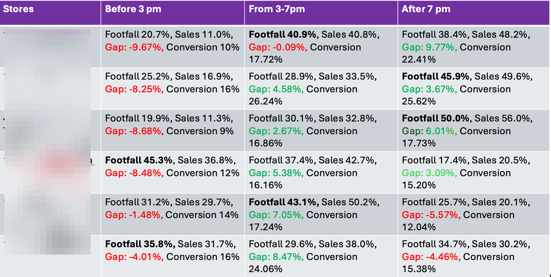 - Some stores showed very large negative gaps in the morning (e.g., >8–10 percentage points), while others over-performed in the same slot. These became natural internal benchmarks.